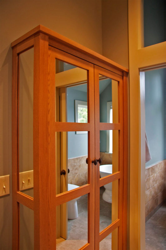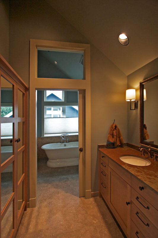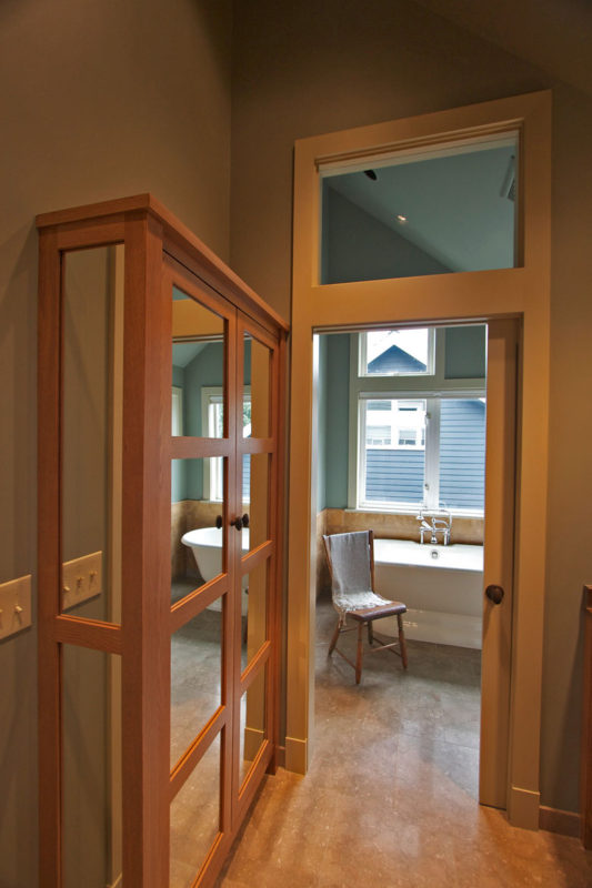 Natural light was a design priority for this Sand Point master bathroom remodel. The exiting doorway to the tub room was relocated. A swing door was removed and replaced with a pocket door with a transom light above. In addition to natural light, ceiling & sconce lighting were added.